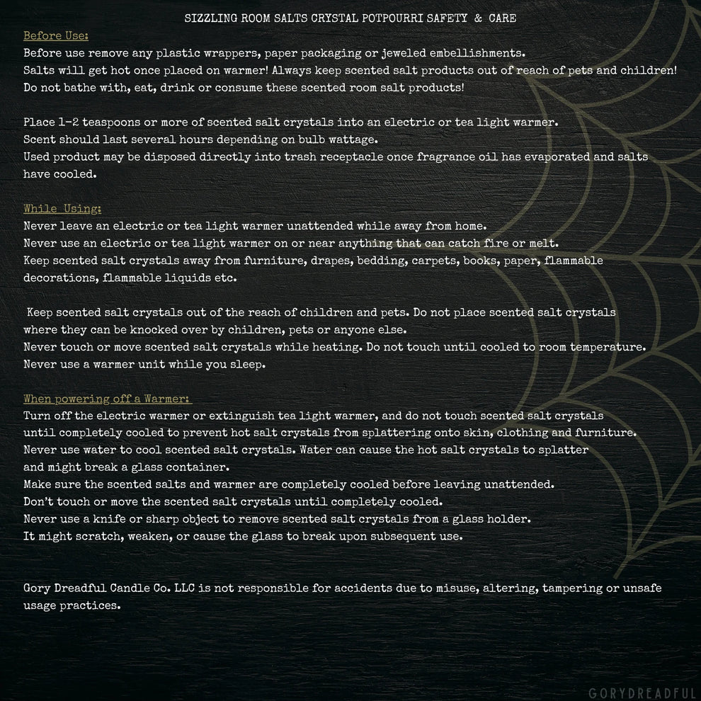 Each of our products come packaged with product safety and care instructions. Every item listing also has an image version and a text version of safety and care guides that must be followed. Gory Dreadful Candle Co. LLC is not responsible for accidents due to misuse, altering, tampering or unsafe usage practices.