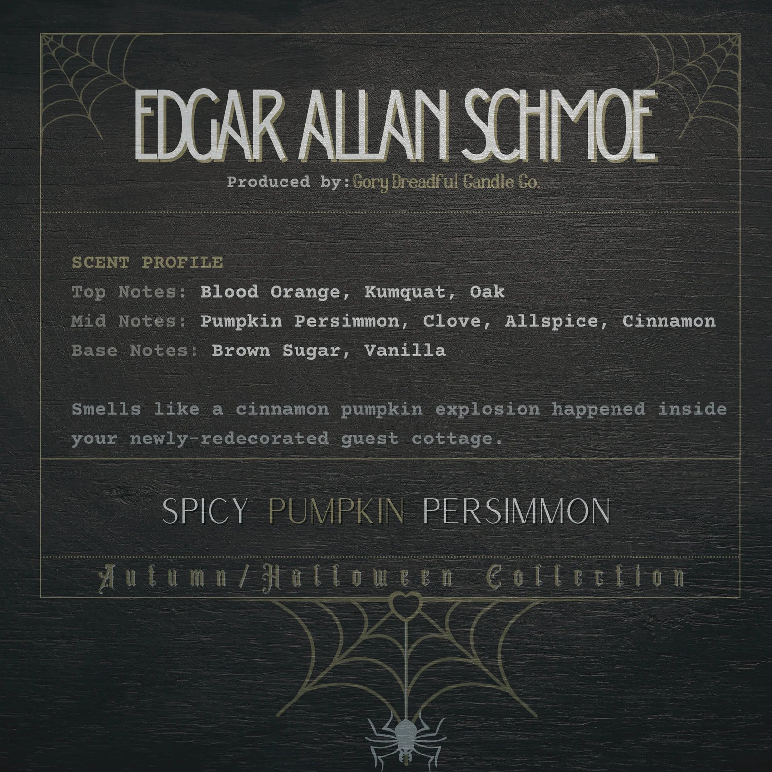 Edgar Allan Schmoe is a mysterious and captivating fragrance that evokes the mood of a Gothic tale. This scent features a tangy and refreshing blend of blood orange, kumquat, and oak as the top notes, creating a citrusy and woody aroma. The heart of the fragrance is a cozy and festive combination of pumpkin persimmon, clove, allspice, and cinnamon, adding a touch of warmth and spice to this dark scent. The base notes of brown sugar and vanilla add a layer of sweetness and comfort to this intriguing fragrance. Edgar Allan Schmoe is the perfect fragrance for experiencing the fierceness of Autumn spice.