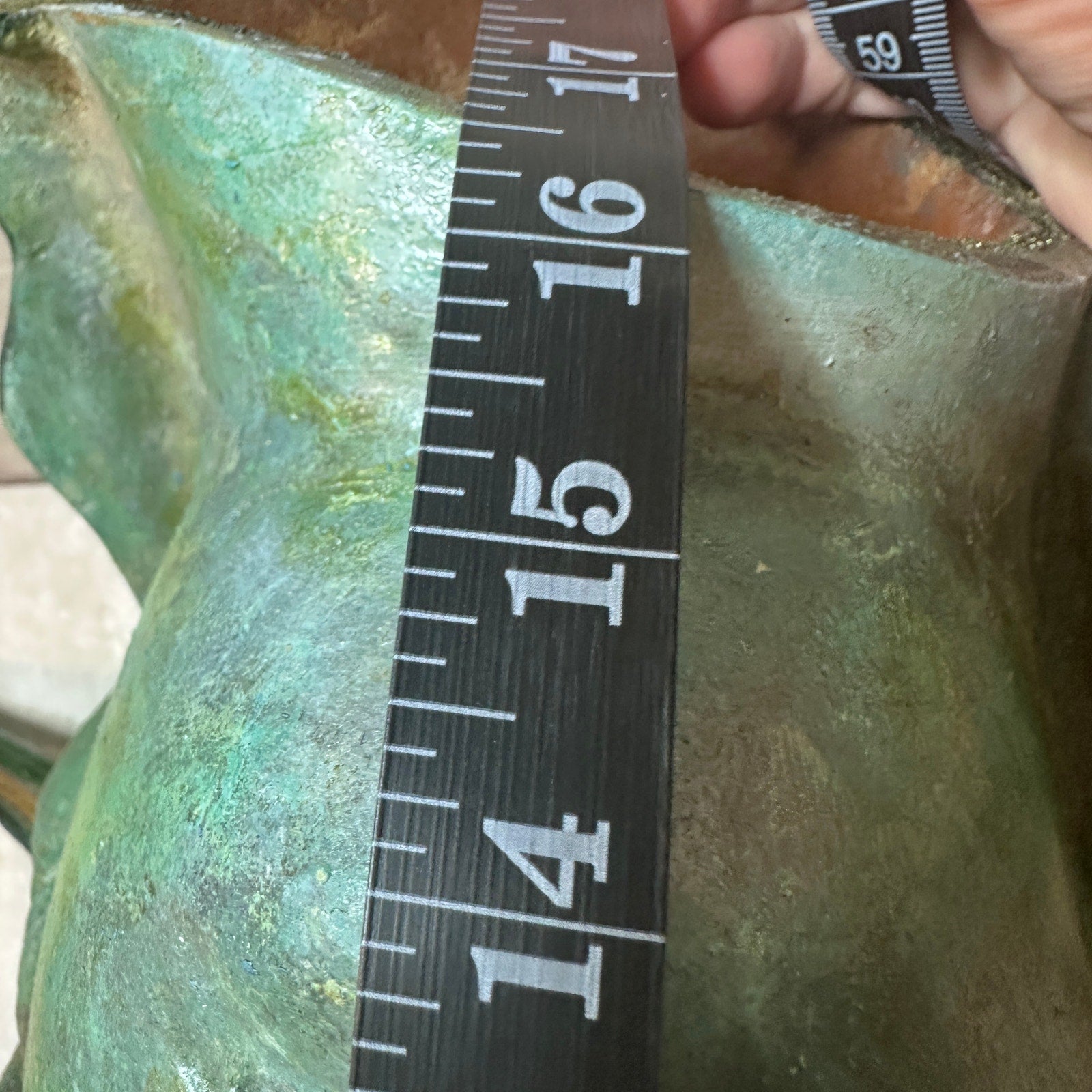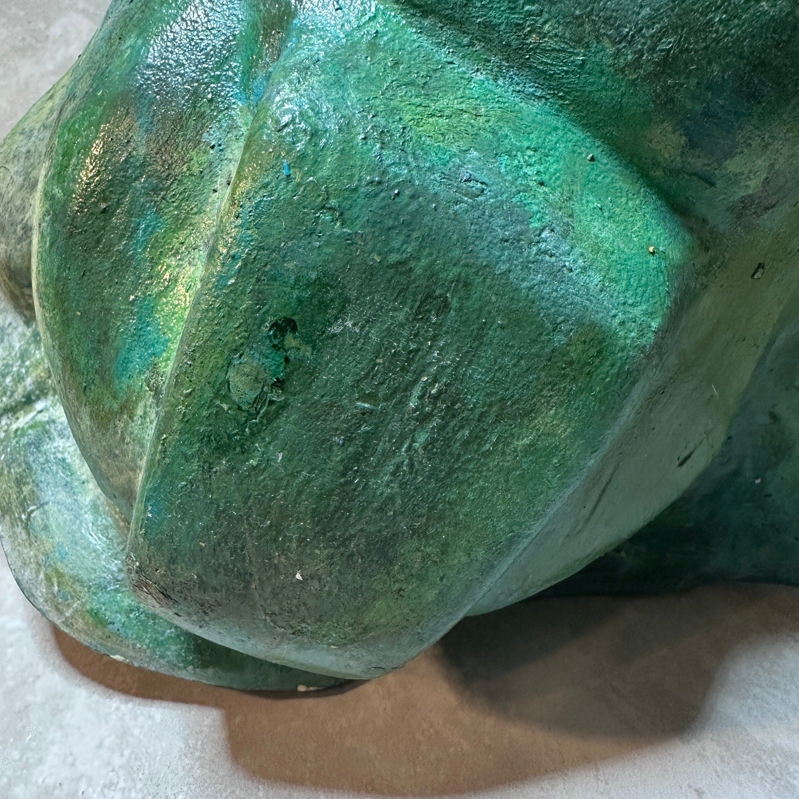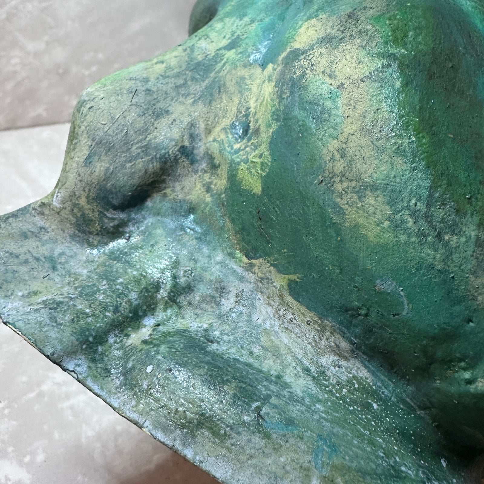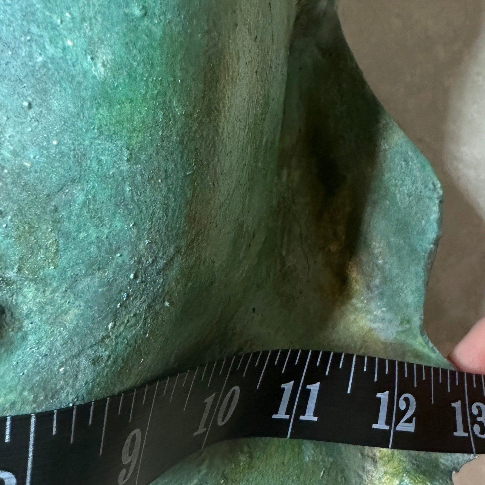 Head of the fiberglass Statue of Liberty from a Red Robin restaurant. (The iconic quirky statue that holds a hamburger greeting customers at the entrance of the older chain restaurants.) This head has been hand-painted by me with a lovely faux patina in honor of Lady Liberty. The rich colors are shades of oxidized green, teal, copper and gold.