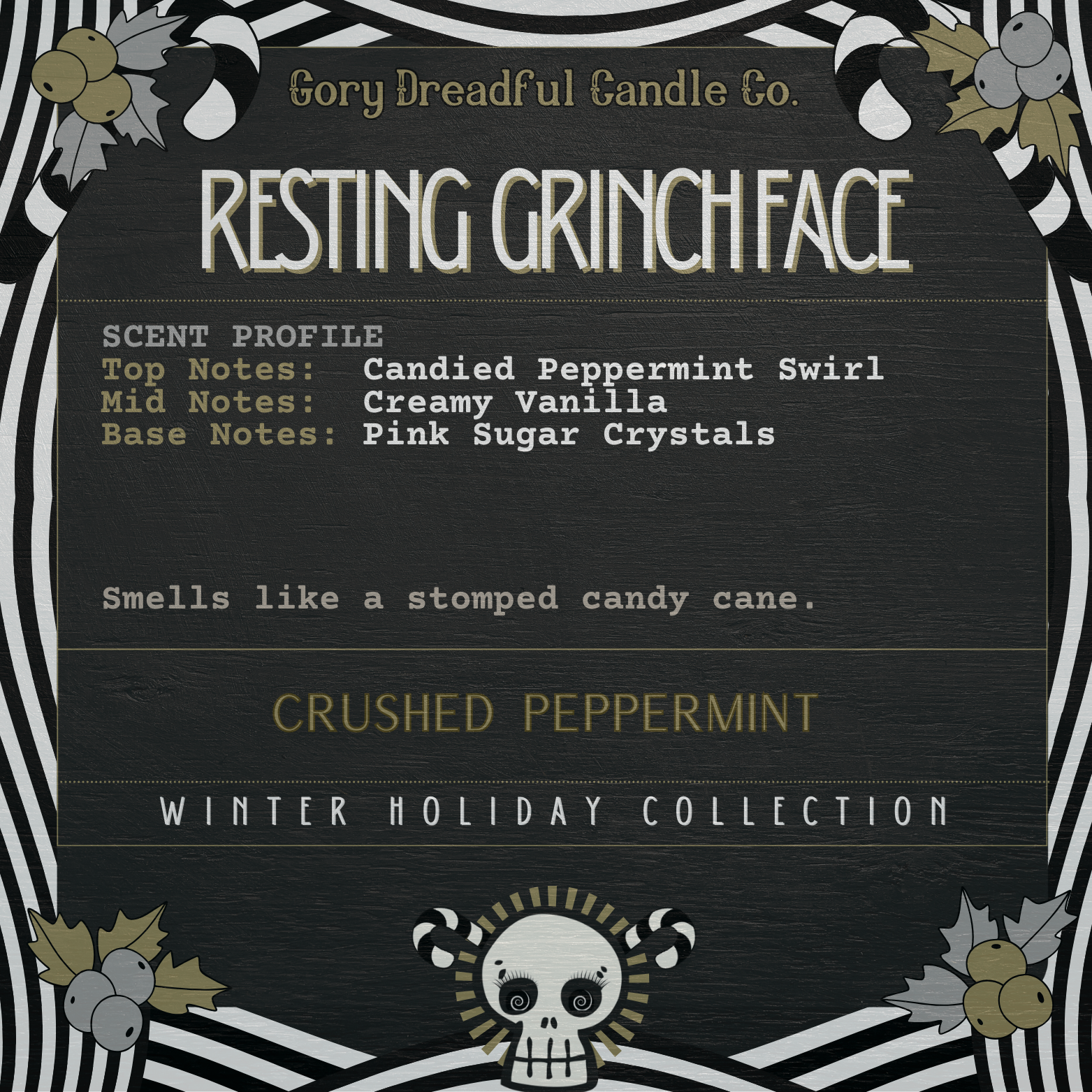 Don't let the holiday hustle get you down. Treat yourself to RESTING GRINCHFACE, a sassy and sweet fragrance that will  invigorate your  body and soul. This scent features a delicious and festive blend of candied peppermint swirl, creamy vanilla, and pink sugar crystals, creating a yummy aroma that smells like a stomped candy cane. Whether you're feeling naughty, grumpy or nice, RESTING GRINCHFACE is the perfect scent to spice up your winter nights.