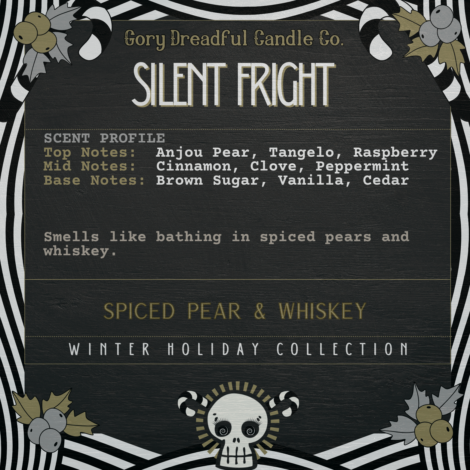 SILENT FRIGHT is a fun and festive fragrance that celebrates the spirit of the holidays. This scent features a fruity and spicy combination of anjou pear, tangelo, and raspberry, enhanced with cinnamon, clove, and peppermint. The base notes of brown sugar, vanilla, and cedar add a touch of sweetness and warmth to this boozy aroma. SILENT FRIGHT is perfect for setting the mood for a spooky festive night, or for treating yourself. Whether you enjoy it with a glass of whiskey, or a bowl of candied pears, SILENT FRIGHT will make you feel like you're soaking in a warm tub of spiced pears and whiskey.