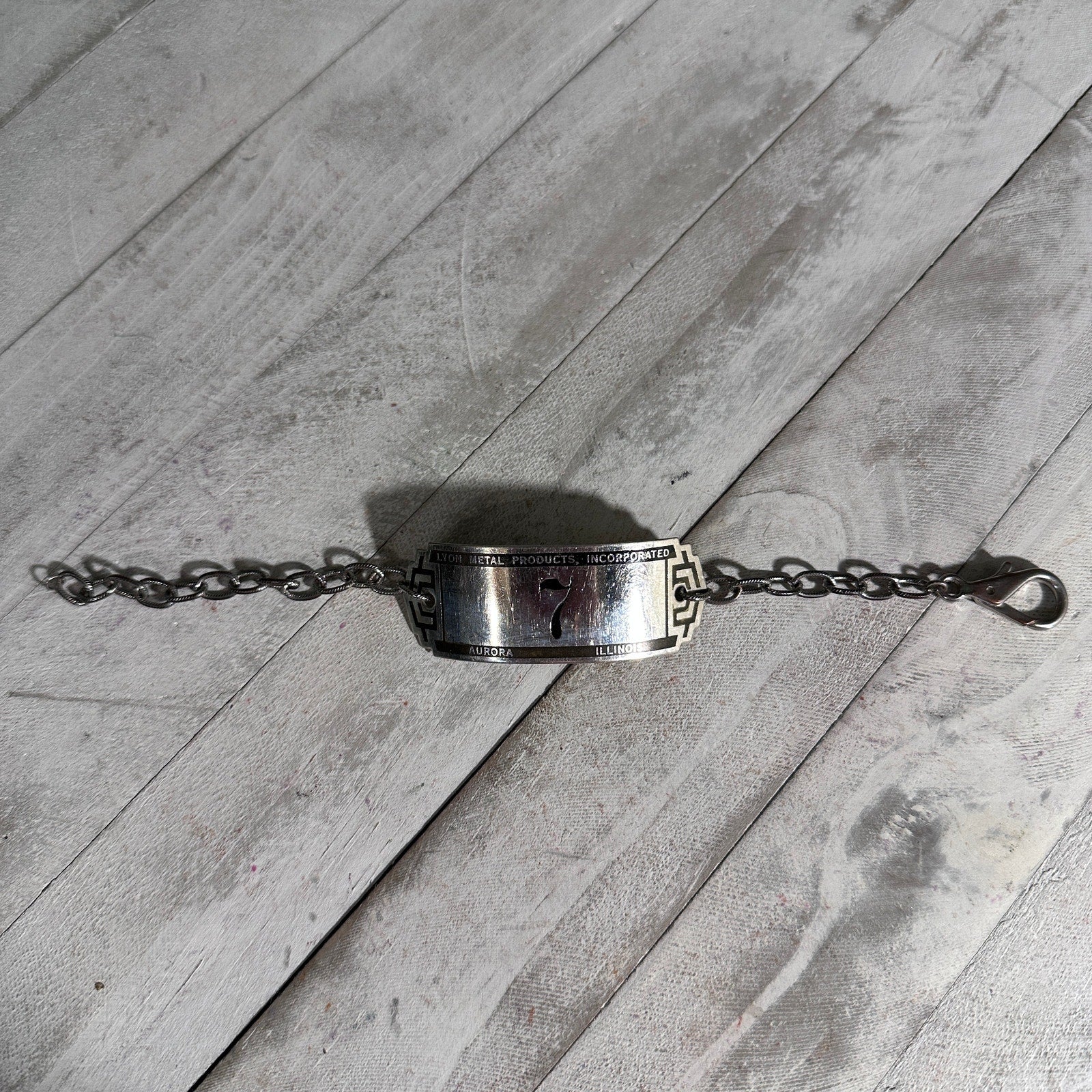 Own a reworked relic of American industrial history, reborn as a lucky #7 statement bracelet. Lyon Metal Products is a leading manufacturer of steel lockers from the early 1900s to present, and the locker tags from 1930’s-1940’s period reflect the industrial design aesthetic of the era with decorative etched nickel-plated brass.