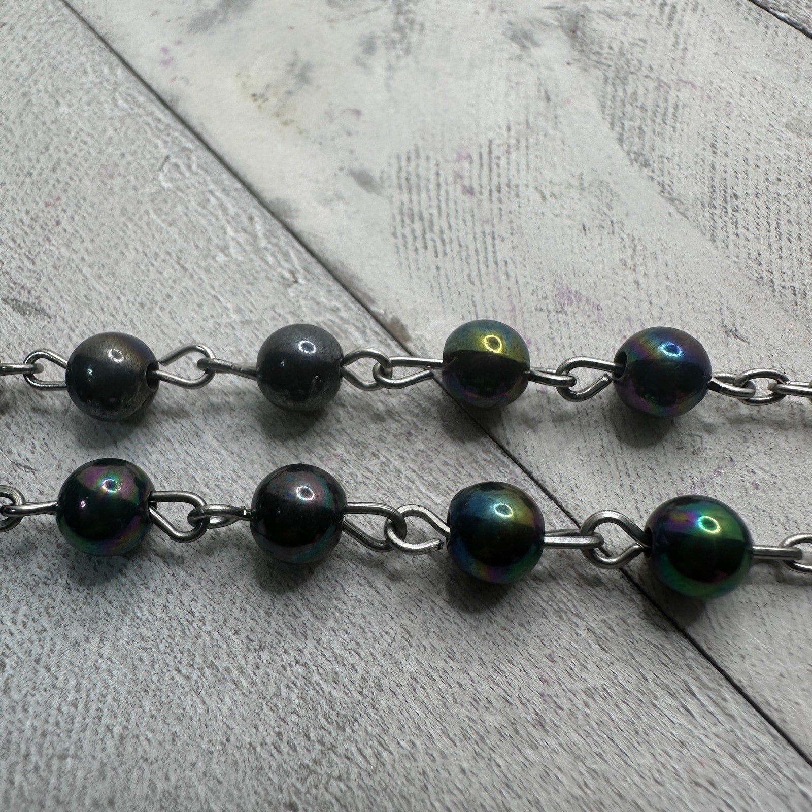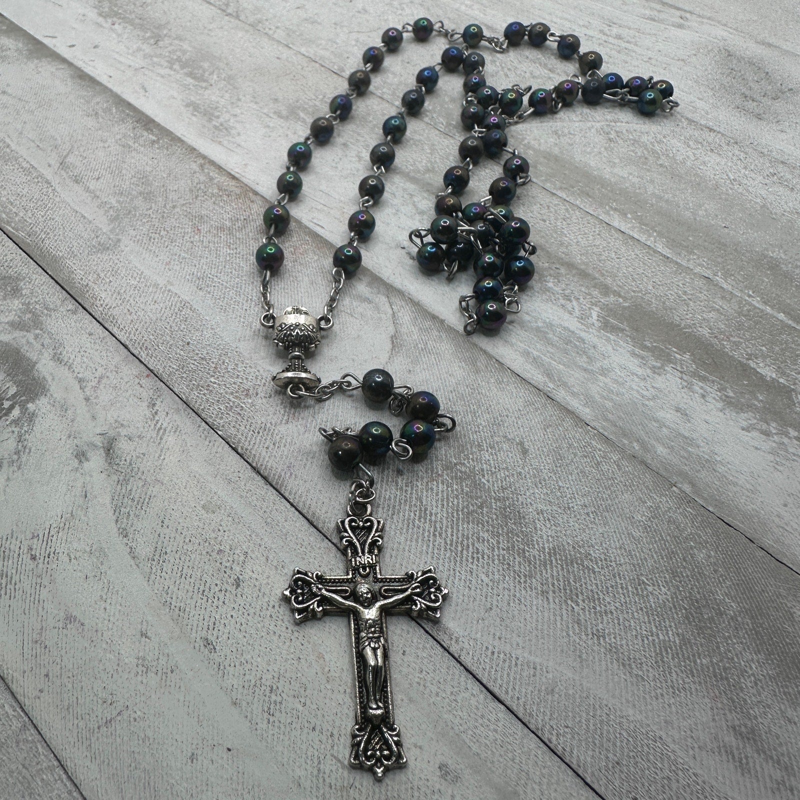 Vintage Black Iridescent Glass Bead Rosary, Catholic Prayer Beads, Silvertone CrucifixATTICOBSCURA11