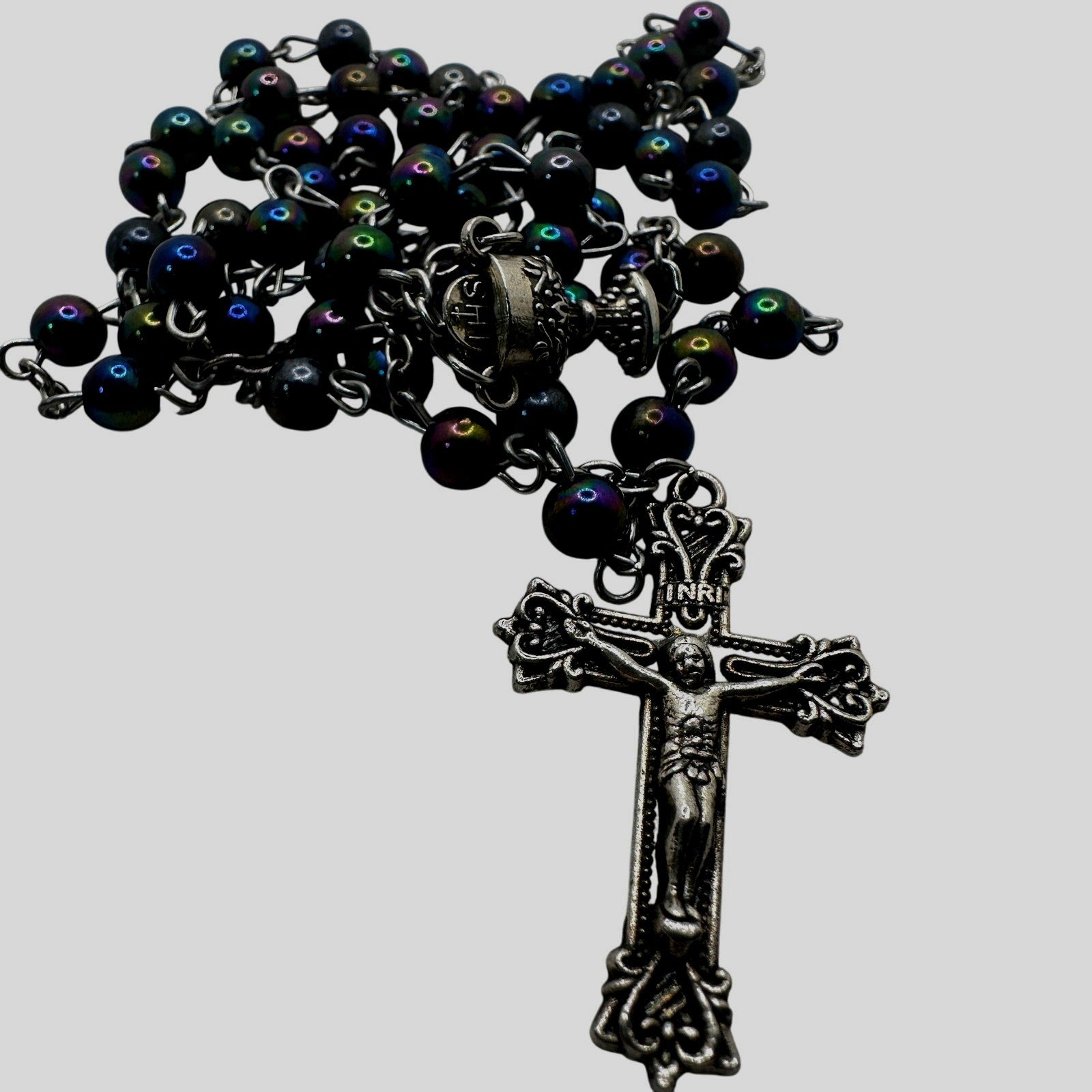 This beautiful vintage rosary is a timeless devotional piece featuring black shimmering iridescent genuine glass beads and traditional metal findings. Detailed crucifix.